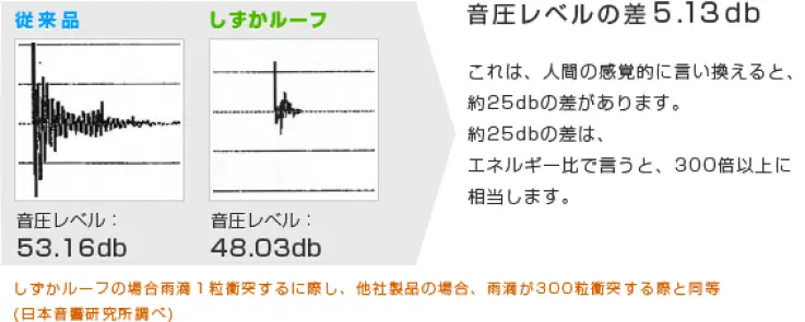 平均音圧レベル差は5.13dB。この5.13dBの差は、エネルギー比で約3.3倍の差を意味します。 また、周波数分析結果では、人間の最も聴覚感度が良い周波数帯(3000~5000Hz付近)において20dB以上の音圧レベル差が認められますので、単に全体の音圧レベルの差5.13dBだけではなく、人間の感覚的にはさらに約20dB差が開くものと考えられます。25dBの差があるという事は、エネルギー比で300倍以上に相当します。よって、シズカルーフに雨粒が1粒衝突した際と、制振鋼板に雨粒が300粒衝突した際とが同等と言えます。